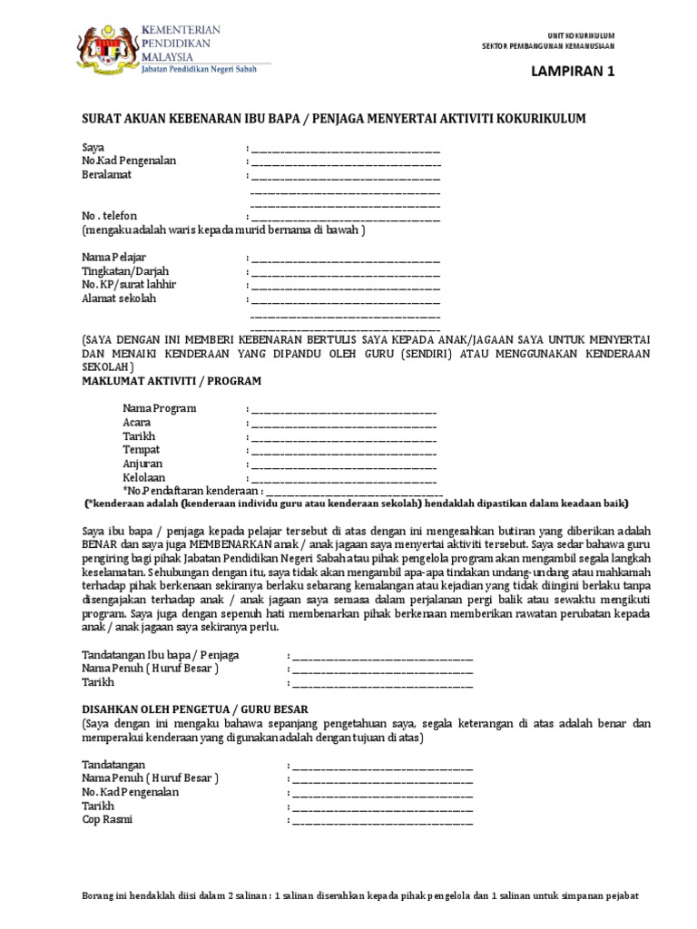 Unit Kokurikulum Surat Akuan Kebenaran Ibu Bapa Dan Penjaga Menyertai Aktiviti Kokurikulum