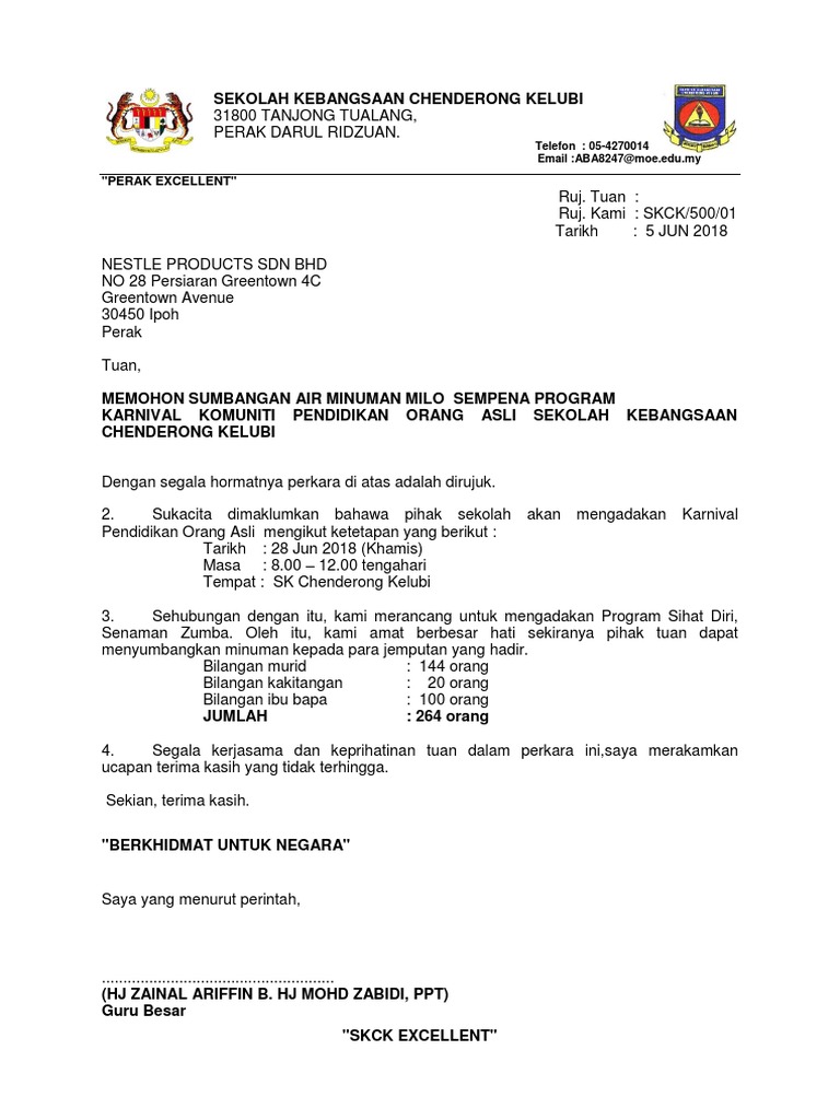 Surat Memohon Sumbangan Minuman Percuma Milo Doc Document