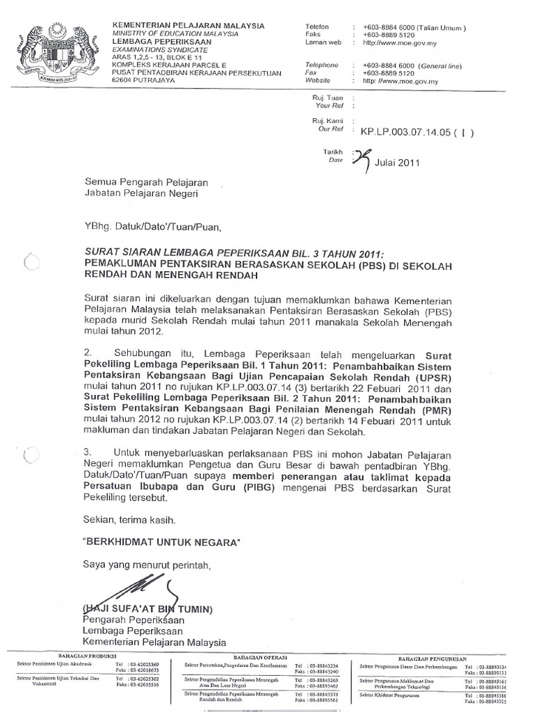 Surat Siaran Lembaga Peperiksaan Pentaksiran Pusat Dalam Pbs Menenga